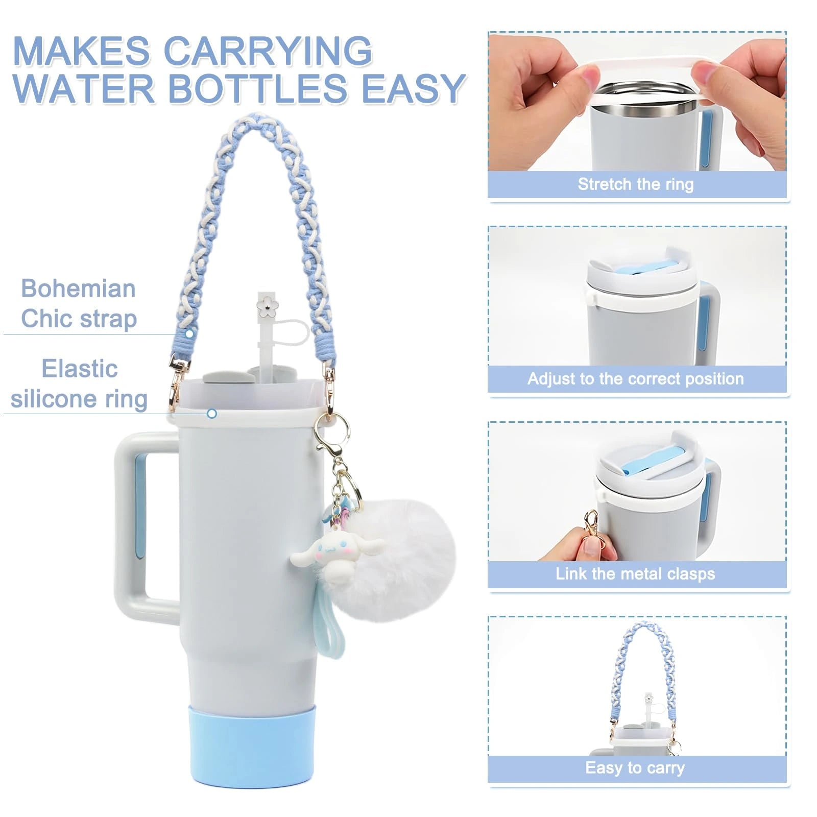 Stanley Cup Accessories Set, Cartoon Cute Pom Pom Design Handle Strap with Keychain, Silicone Stanley Cup Boot, Straw Topper